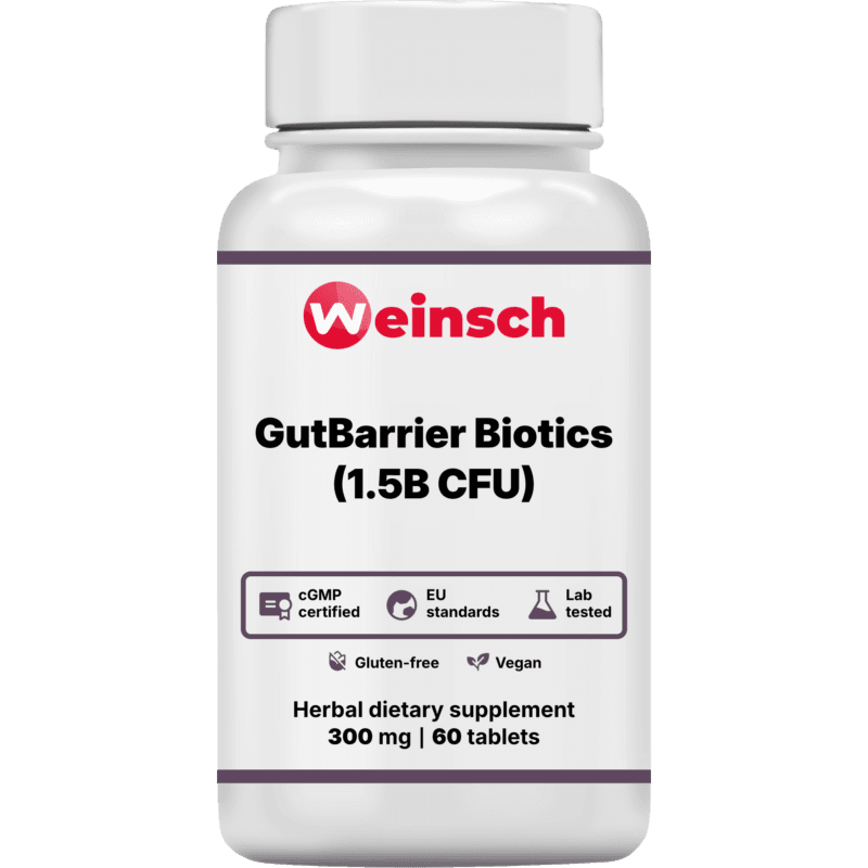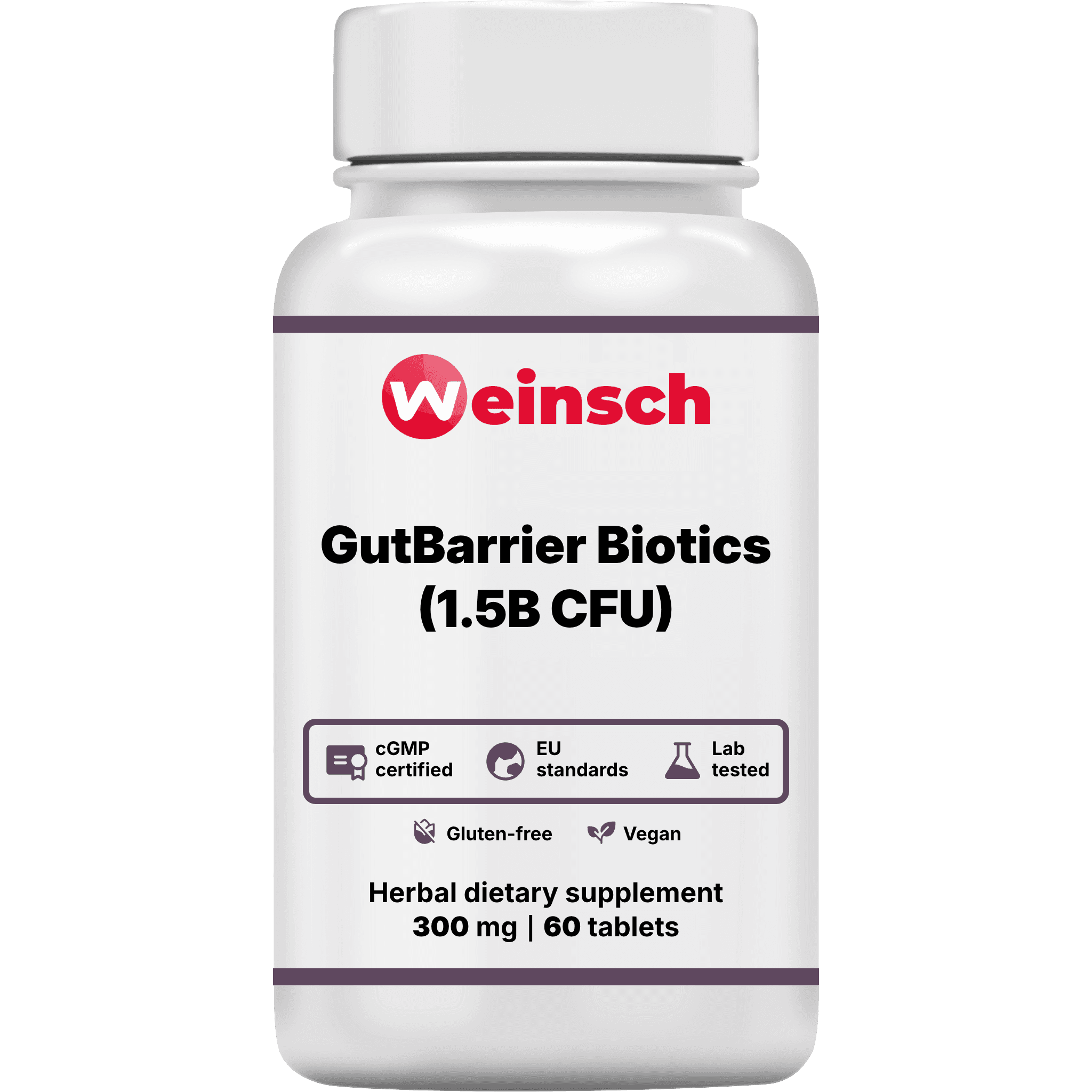 Weinsch GutBarrier Biotics (1.5B CFU) (Yin Deficiency, Spleen Qi Deficiency Constitution) delivers a gentle, highly targeted probiotic blend designed to soothe, hydrate, and restore the delicate intestinal mucosal lining. Because a compromised gut barrier often struggles with chronic irritation and dryness, this specialized 1.5-billion CFU complex provides micro-dosed support to stimulate the production of mucin without overwhelming a highly sensitive digestive tract. These beneficial strains work to lock in cellular moisture, reduce localized inflammation, and improve the smooth transit of waste. By nurturing the gut's natural lubricating secretions and easing internal spasms, this formula creates a calm, hydrated internal environment. It supports optimal nutrient absorption while providing deep, soothing relief for sensitive, overstimulated, or dry digestive systems.